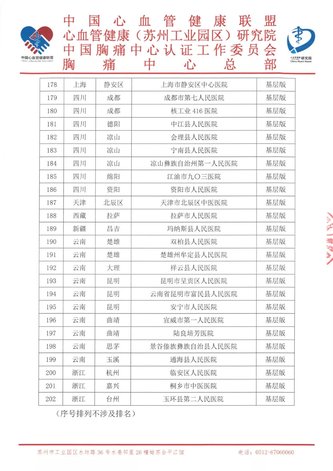 中國(guó)胸痛中心認(rèn)證工作委員會(huì)和胸痛中心總部于2018年11月10日在胸痛中心總部官方網(wǎng)站以及胸痛中心總部微信公眾號(hào)上公布了“關(guān)于接受2019年度第一批次中國(guó)胸痛中心認(rèn)證的申請(qǐng)通知”。截止到2018年12月2日22:00共接到246家胸痛中心的申請(qǐng)(不含廣東省),經(jīng)過(guò)初步資格預(yù)審,現(xiàn)有202家胸痛中心符合參加本批次認(rèn)證的基本資格,進(jìn)入材料初審階段。其中74家符合標(biāo)準(zhǔn)版胸痛中心認(rèn)證基本資質(zhì),128家符合基層版胸痛中心認(rèn)證基本資質(zhì),現(xiàn)將名單公告如下: