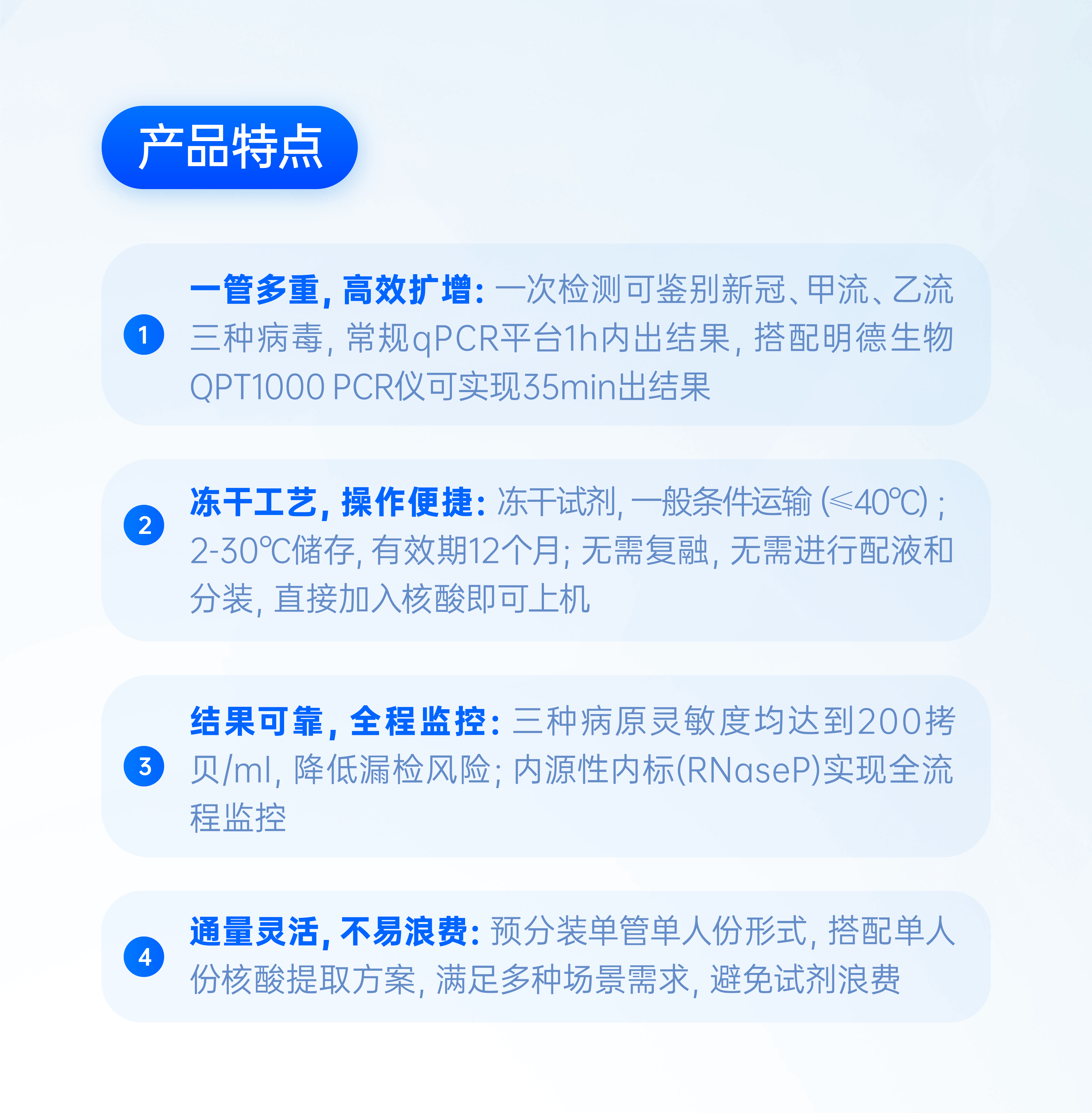 明德生物始終堅(jiān)持“以客戶(hù)為中心”的核心價(jià)值觀指導(dǎo)產(chǎn)品開(kāi)發(fā),貼近實(shí)際應(yīng)用場(chǎng)景,直面客戶(hù)問(wèn)題,采用凍干微球技術(shù),實(shí)現(xiàn)常溫運(yùn)輸與儲(chǔ)備,降低流通成本,延長(zhǎng)試劑效期,為明德預(yù)混技術(shù)之后的再次創(chuàng)新。該產(chǎn)品的上市象征明德生物呼吸道系列產(chǎn)品跨出關(guān)鍵的第一步。