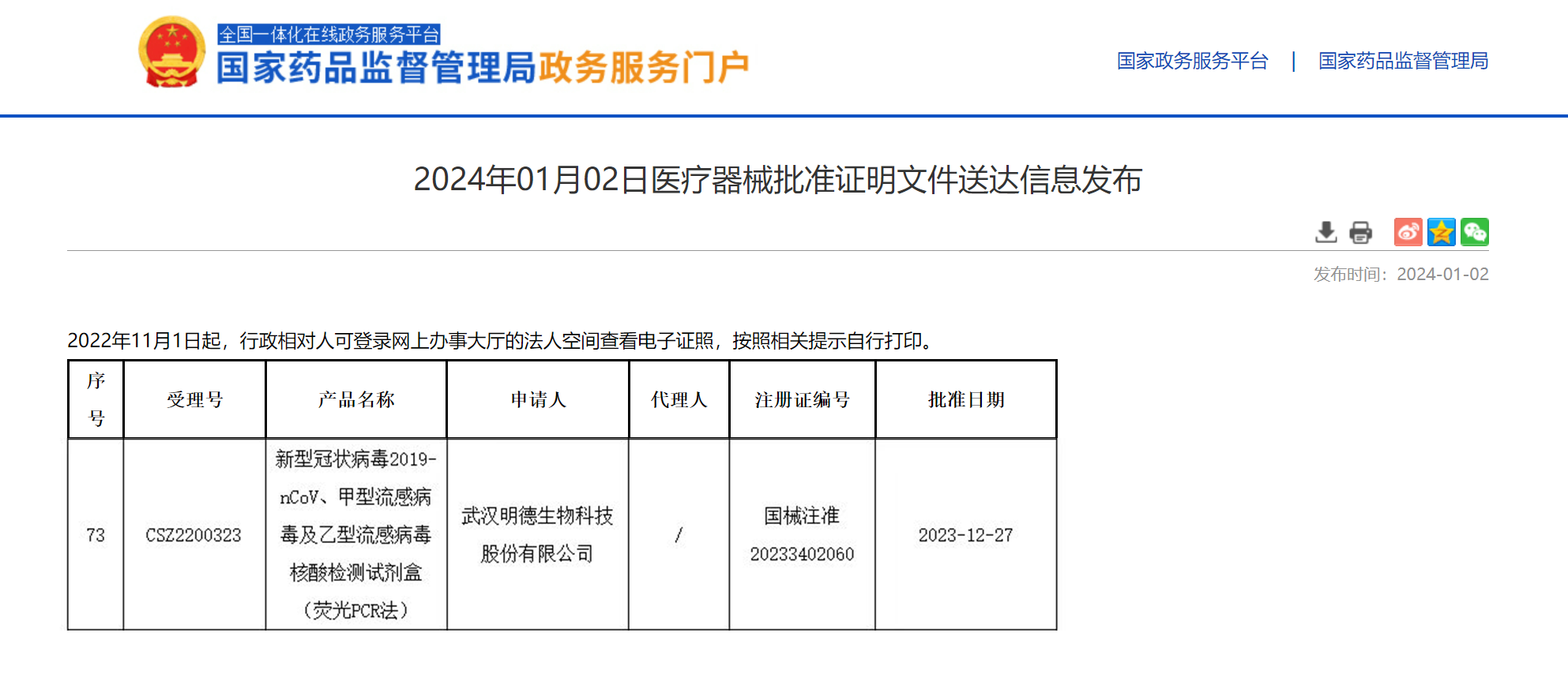 2024新年伊始,武漢明德生物科技股份有限公司自主研發(fā)生產(chǎn)的“新型冠狀病毒2019-nCoV、甲型流感病毒及乙型流感病毒核酸檢測(cè)試劑盒(熒光PCR法)”獲得國(guó)家藥品監(jiān)督管理局(NMPA)第Ⅲ類(lèi)醫(yī)療器械注冊(cè)證(國(guó)械注準(zhǔn)20233402060)。