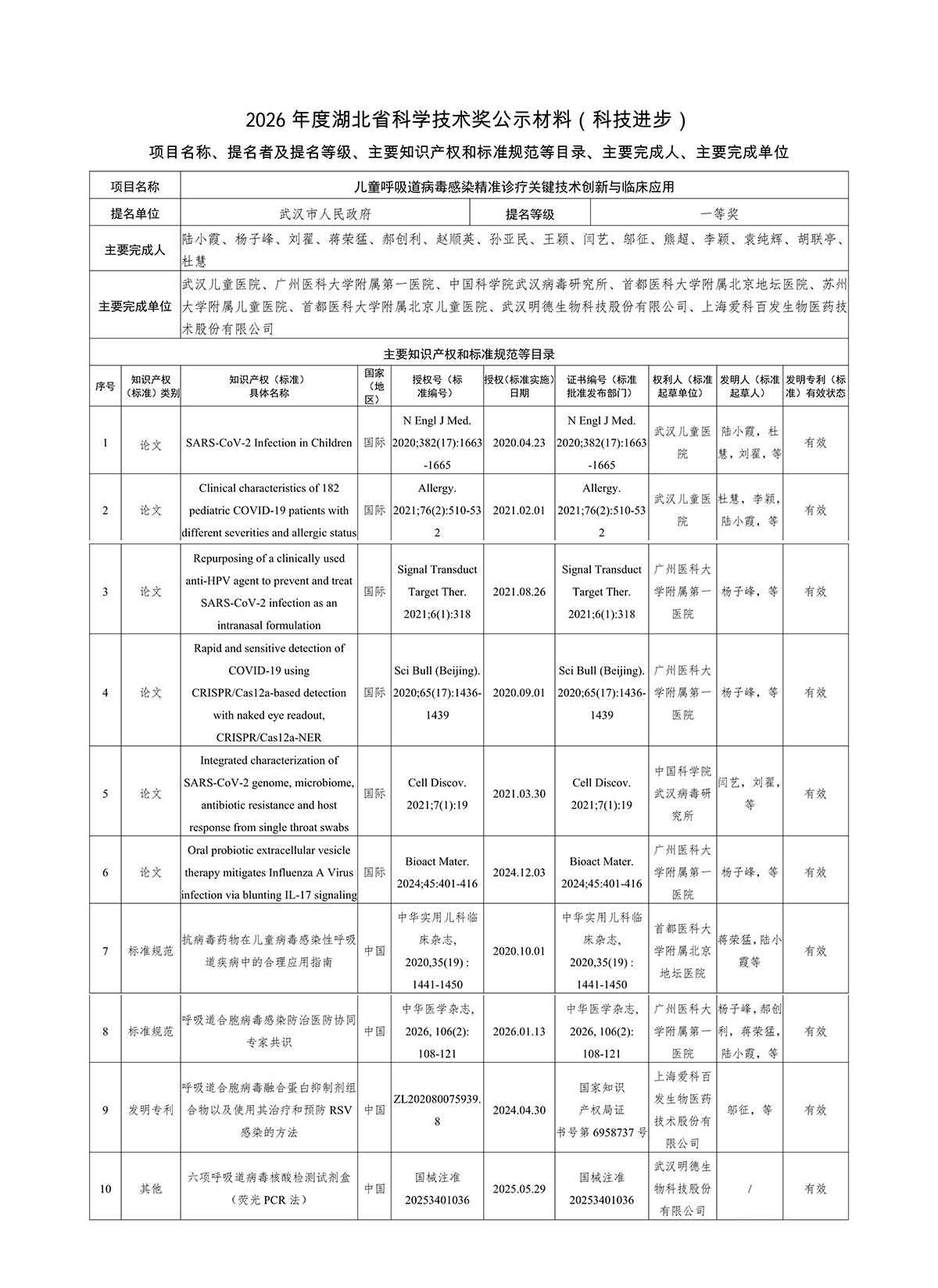2026 年度湖北省科學(xué)技術(shù)獎公示——兒童呼吸道病毒感染精準(zhǔn)診療關(guān)鍵技術(shù)創(chuàng)新與臨床應(yīng)用