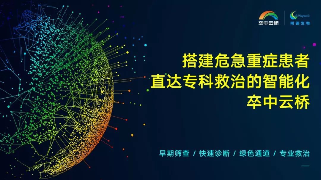 明德生物卒中中心解決方案“卒中云橋“工程是明德生物急危重癥智能化救治體系建設(shè)的組成部分(同期還有胸痛中心、心電網(wǎng)絡(luò)等),依托物聯(lián)網(wǎng)、云計(jì)算、人工智能、大數(shù)據(jù)分析等關(guān)鍵技術(shù),立足分級(jí)診療、雙向轉(zhuǎn)診、臨床路徑、綠色通道等惠民政策,解決危急重癥患者全流程防治質(zhì)控管理的難題,打通一條從患者到?茍F(tuán)隊(duì)的VIP救治通道,早發(fā)現(xiàn)、早治療、早康復(fù),搭建出一座讓患者走向健康的生命之橋。目前明德生物搭建的“卒中云橋”卒中中心已經(jīng)覆蓋重慶、云南、湖北等地多家三甲醫(yī)院,助力實(shí)現(xiàn)卒中中心區(qū)域智慧化平臺(tái)建設(shè)。1年之內(nèi),明德“卒中云橋”工程計(jì)劃覆蓋國(guó)內(nèi)1000家醫(yī)療機(jī)構(gòu);3年之內(nèi),明德“卒中云橋”工程將輻射中國(guó)2億心腦血管高危人群,成為造福國(guó)民健康的重大民生推動(dòng)工程。