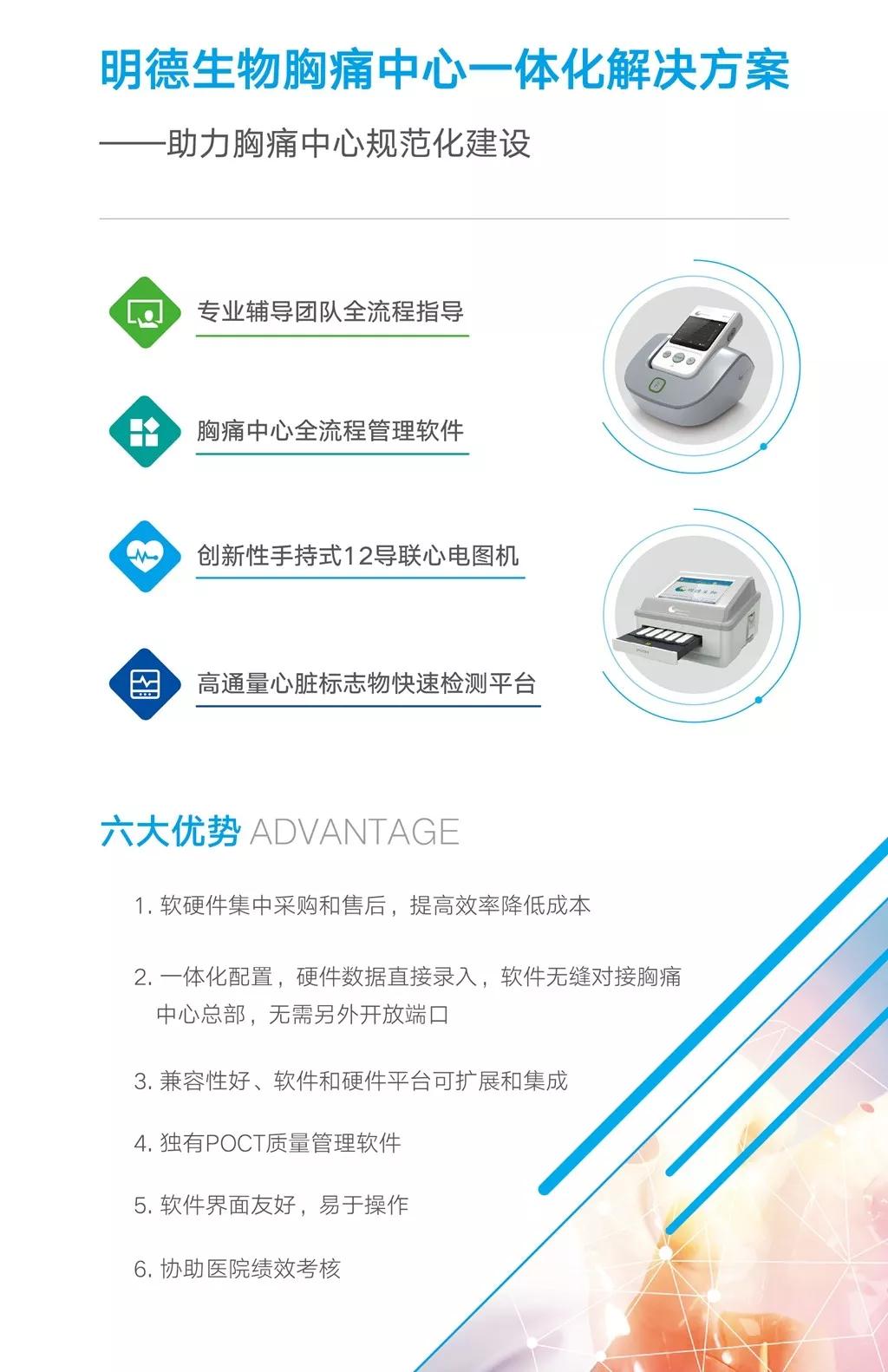 明德生物是國內(nèi)首家提供胸痛中心從前期幫扶、方案設(shè)計、軟硬件產(chǎn)品一體化實施整體服務(wù)的IVD企業(yè),開創(chuàng)了胸痛中心建設(shè)的“明德模式”。