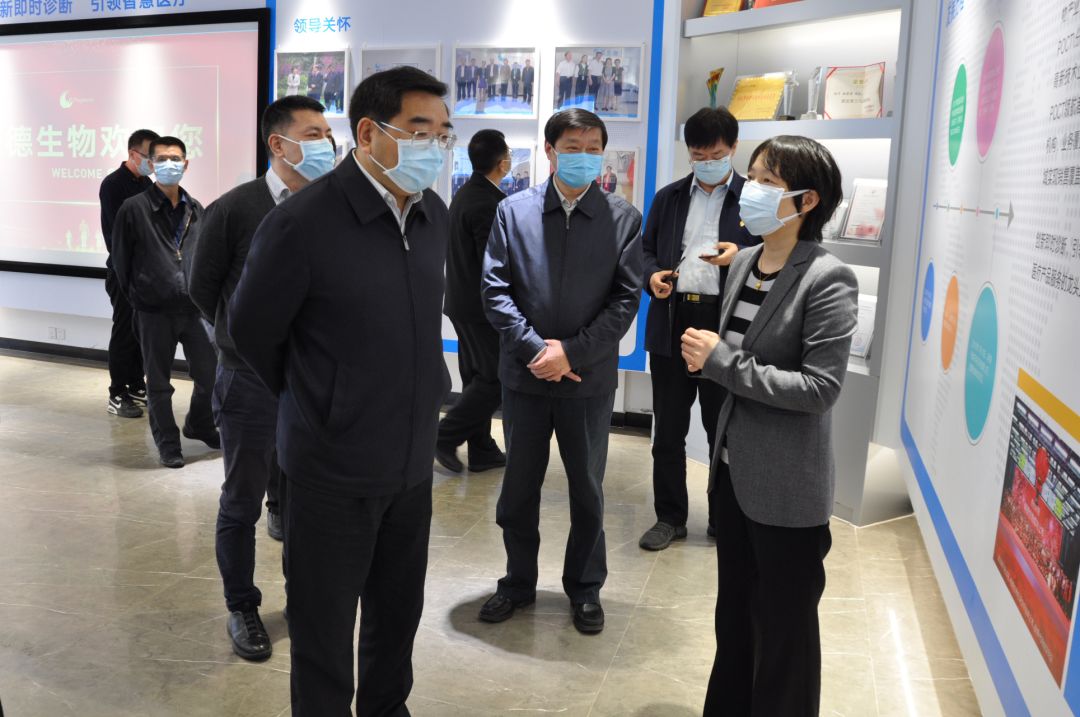 在產(chǎn)品展示廳,陳莉莉董事長向連維良副主任匯報了明德生物抗擊疫情,研發(fā)新冠檢測試劑的情況。介紹了明德生物POCT、分子診斷、血氣分析、胸痛中心建設(shè)、卒中中心建設(shè)科技創(chuàng)新產(chǎn)品的市場應(yīng)用情況。