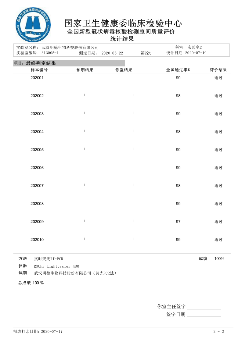 近日,武漢明德生物科技股份有限公司滿分通過國家衛(wèi)生健康委臨床檢驗中心組織的2020年第二次全國新型冠狀病毒核酸檢測室間質(zhì)量評價。