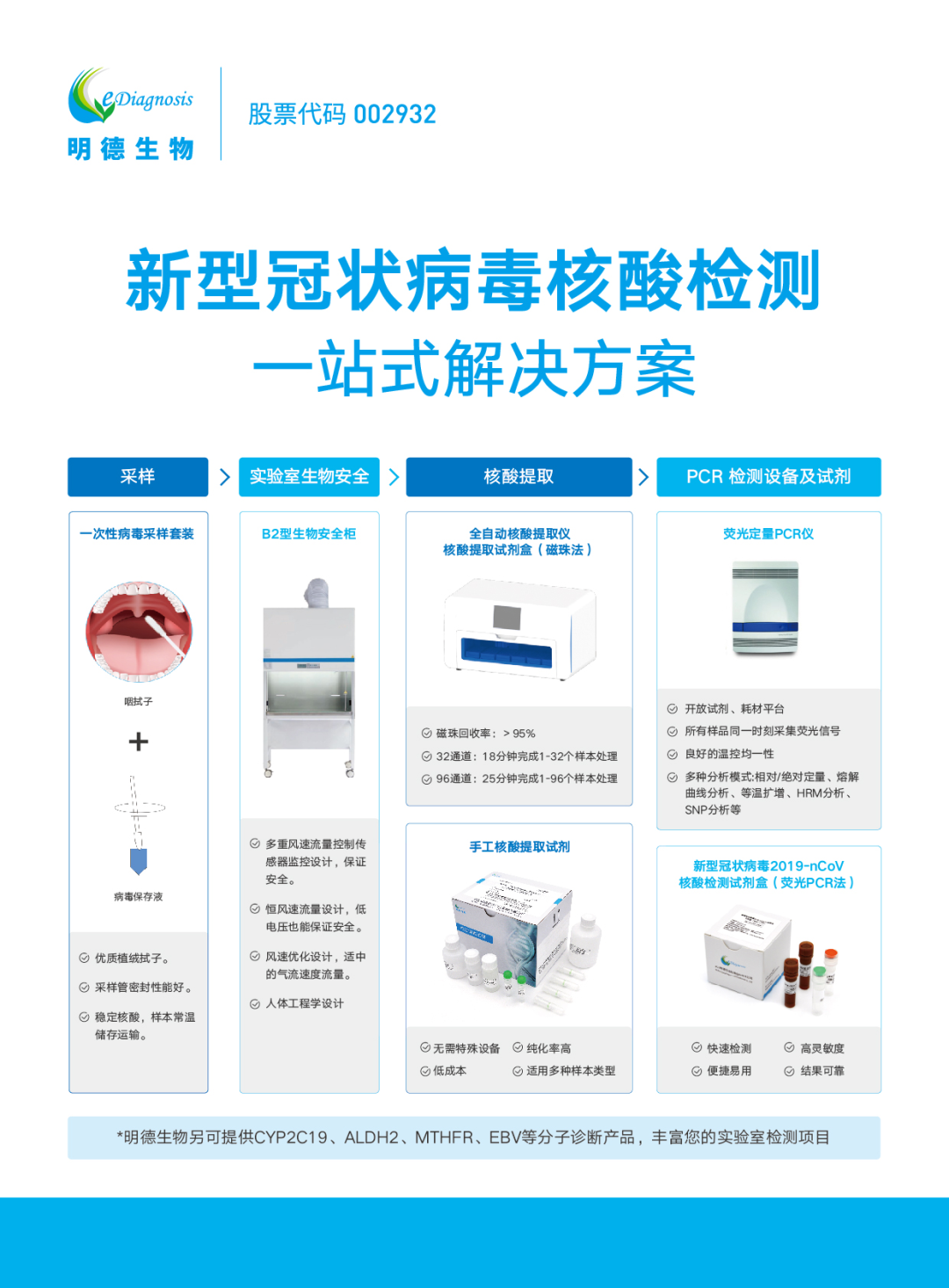 明德生物秉承“創(chuàng)新即時診斷 引領智慧醫(yī)療”的企業(yè)使命,不斷推陳出新,除新冠核酸檢測試劑盒外,更先后推出一站式新冠核酸檢測解決方案和PCR實驗室建設方案,為各級醫(yī)療機構疫情防控工作高效有序的開展作出了貢獻。