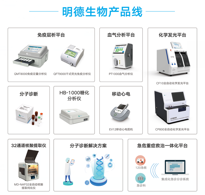 武漢明德生物科技股份有限公司(深交所上市企業(yè) 002932), 2008 年成立,坐落于國家生物產(chǎn)業(yè)基地——武漢光谷生物城。是一家專注于為醫(yī)療機構提供創(chuàng)新領先醫(yī)療產(chǎn)品和服務的國家高新技術企業(yè),湖北省企業(yè)技術中心,武漢市企業(yè)研究開發(fā)中心。公司主營業(yè)務涵蓋POCT、化學發(fā)光、血氣分析、分子診斷項目以及急危重癥救治一體化平臺(胸痛中心/卒中中心/創(chuàng)傷中心)等。目前公司產(chǎn)品已覆蓋全國30個省、直轄市、自治區(qū)近5000家醫(yī)療機構,同時在亞洲、歐盟、南美等多個區(qū)域實現(xiàn)銷售布局。