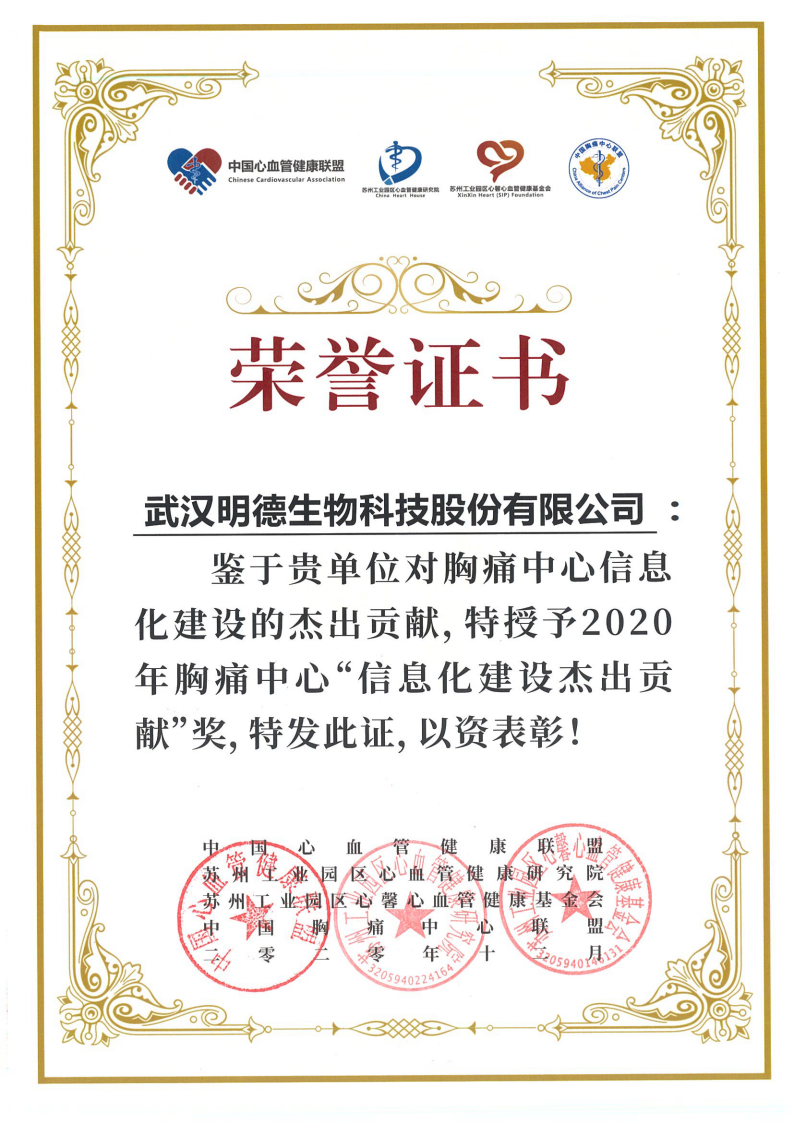 2020年12月召開(kāi)的全國(guó)第十屆胸痛大會(huì)上,明德生物斬獲“信息化建設(shè)杰出貢獻(xiàn)”獎(jiǎng)項(xiàng)。明德生物合作的武鳴區(qū)中醫(yī)醫(yī)院、十堰市太和醫(yī)院及英山縣人民醫(yī)院三家醫(yī)院也分別取得了“智慧胸痛中心建設(shè)優(yōu)秀獎(jiǎng)”獲得行業(yè)肯定。