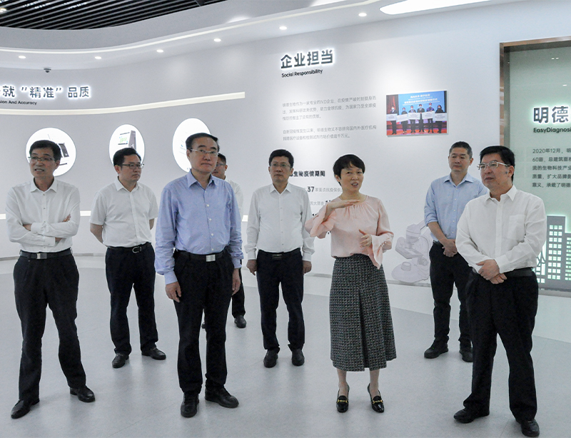陳莉莉博士向陳平書記一行介紹了明德生物發(fā)展規(guī)劃、科技創(chuàng)新成果以及智慧診斷整體解決方案的市場(chǎng)應(yīng)用情況,期待與棗莊市高新區(qū)的合作為明德生物的版圖增添新的活力。陳平書記指出,明德生物作為高新技術(shù)企業(yè),產(chǎn)品技術(shù)領(lǐng)先,發(fā)展?jié)摿薮,具有高度社?huì)責(zé)任感,對(duì)行業(yè)發(fā)展帶來了積極影響。棗莊市區(qū)位優(yōu)勢(shì)明顯,醫(yī)療衛(wèi)生基礎(chǔ)較好,歡迎明德生物到棗莊發(fā)展,以創(chuàng)新優(yōu)質(zhì)的診斷產(chǎn)品、精準(zhǔn)高效的第三方檢測(cè)服務(wù)以及分秒必爭(zhēng)的急危重癥整體解決方案與棗莊智慧城市建設(shè)相結(jié)合,服務(wù)民生,為群眾提供優(yōu)質(zhì)、高效、便捷的智慧醫(yī)療服務(wù)。