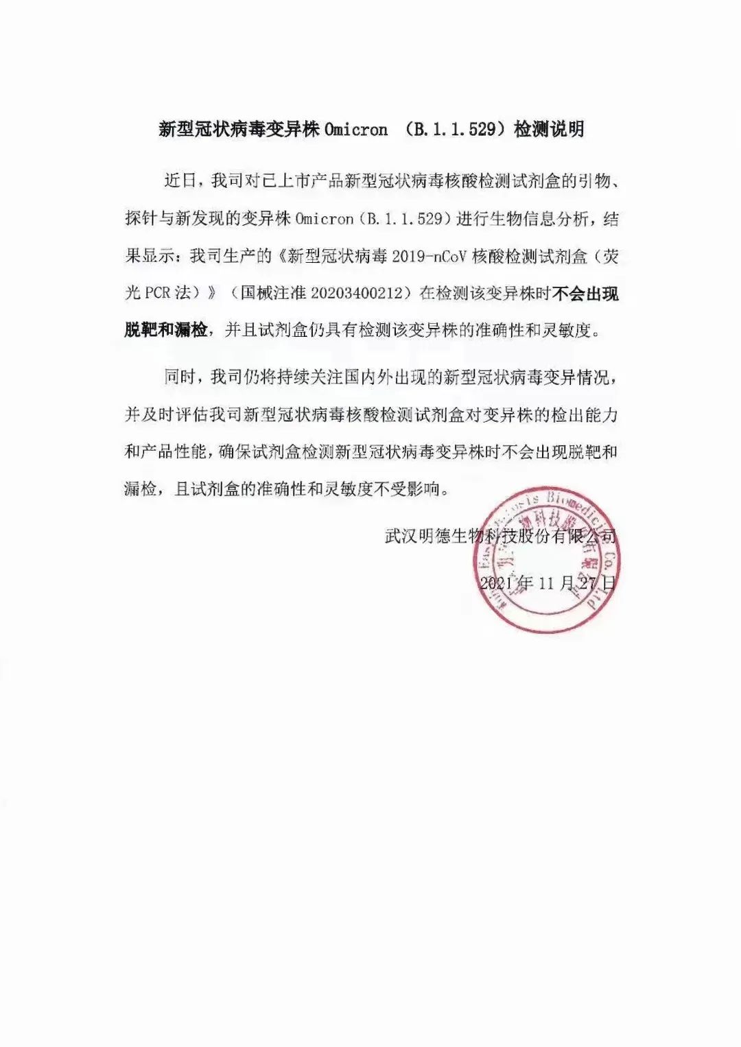 “近日,我司對已上市產(chǎn)品新型冠狀病毒核酸檢測試劑盒的引物、探針與新發(fā)現(xiàn)的變異株Omicron(B.1.1.529)進(jìn)行生物信息分析,結(jié)果顯示:我司生產(chǎn)的新型冠狀病毒2019-nCoV核酸檢測試劑盒(熒光PCR法)(國械注準(zhǔn)20203400212)在檢測該變異株時不會出現(xiàn)脫靶和漏檢,并且試劑盒仍具有檢測該變異株的準(zhǔn)確性和靈敏度。”