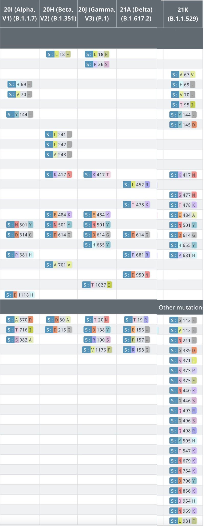 △五種突變株 alpha、beta、gamma、dental、omicron的突變對比